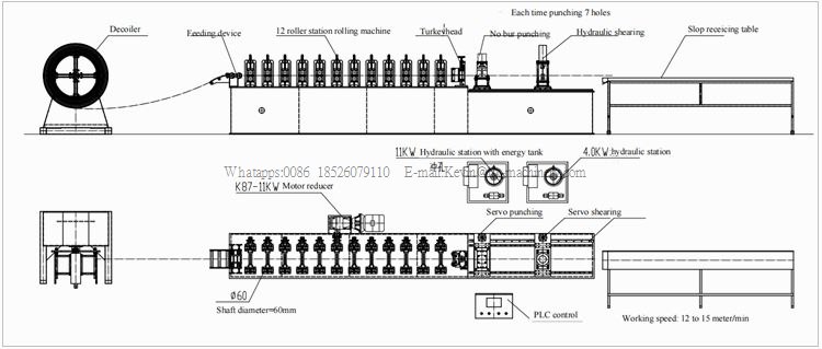 Uncoiling → Leveling → Roll forming system→ Punching system→ Cutting system → Products receiving table