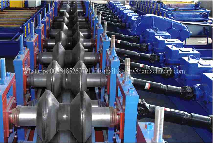 Roll Forming Stations:** 11-25 precision forming stations depending on profile complexity, with mechanical spreading width of 550mm . Main shaft diameter: Φ70-110mm (40Cr quenched steel) . Forming rollers are manufactured from premium GCr15 bearing steel, overall quenched hardness HRC58°-62°, hard chrome plated for exceptional wear resistance . Frame construction: Heavy-duty HT200 cast iron or 400# H steel welded structure, ensuring long-term stability under continuous heavy-load operation . Transmission: Gearbox-driven system with universal transmission shafts, delivering robust torque for forming guardrail steel up to 4.0-4.5mm thickness . Heavy-duty versions capable of handling up to 6.0mm thickness are available from specialized **Guardrail roll forming machine suppliers** .
